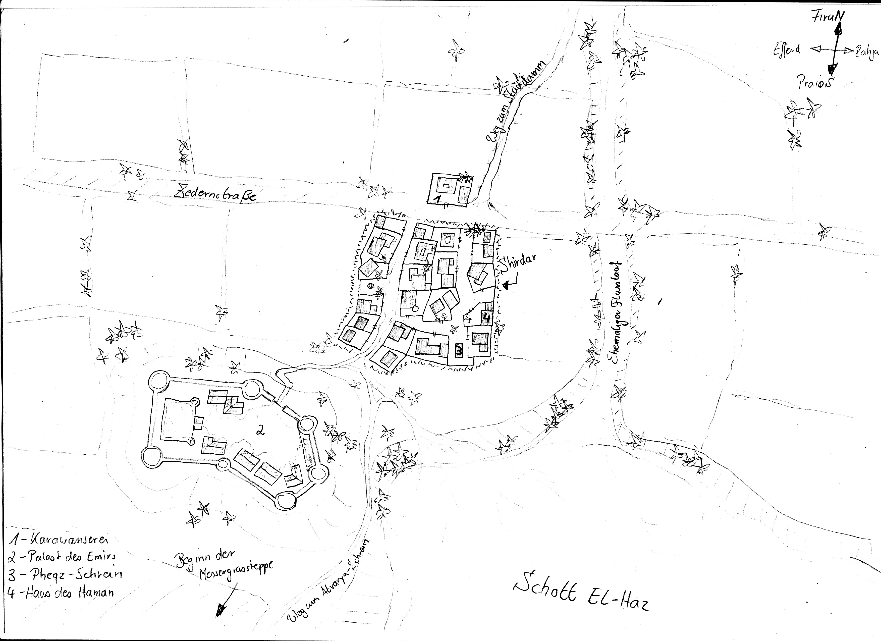 Weitere Ideen, wenn ich die Karte richtig verstanden habe, dann führt der Zufluss des Shott El-Haz zu einer Überschwemmung der Karawanenroute nach Fasar, deswegen würde ich da mittels Elementarer Diener des Erzes eine Brücke errichten lassen wollen. Auf der dem Dorfabgewandten Seite wäre sicherlich ein Gebäude zum eintreiben von Geldern aller arten ganzpraktisch (also eine Art Zollhaus), ein weiteres Gebäude dieser Art sollte auch an der Weggabelung nahe Quadanagar errichtet werden.