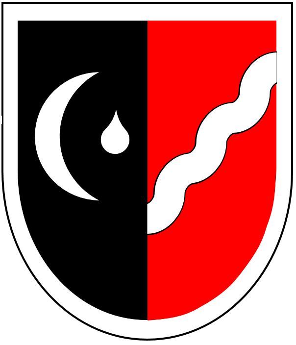 Heraldik: Geteiltes Wappen. Links auf schwarzen Grund das silberne Madamal im Kelch mit dem silbernen Blutstropfen. Rechts auf rotem Grund ein silbernen Fluss (Als Anlehnung an das Wappen Hochstieg, der den Fluss Hard im Wappen trägt.)