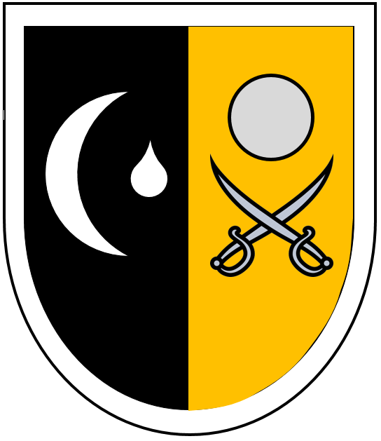 Heraldik: Geteiltes Wappen. Links auf schwarzen Grund das silberne Madamal im Kelch mit dem silbernen Blutstropfen. Rechts auf sonnengelben Grund zwei gekreuzte grau Schwerter unter einem grauen Madamal im Rad (In Anlehnung an das Wappen von Shirdar)