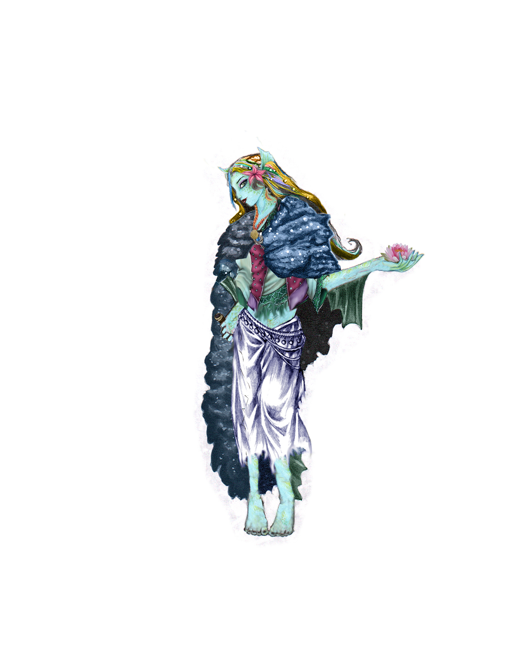 Aussehen: Eine tiefverhüllte Gestalt von 1,70 Schritt, behangen mit diversen Wasserschläuchen. Die Hände verschwinden in den Ärmeln des weiten Hemdes. Das Hemd schmiegt sich einigermaßen gut an den Körper, wird allerdings größtenteils durch einen Umhang verdeckt. Die ebenfalls weite Hose, ist so geschnitten, dass sie bis zu den Knien an den Körper anschmiegt und danach weiter ausfällt, die Schuhe gehen hoch bis zu den Wadenbeinen. Es wirkt ungewöhnlich, dass die Gestalt fast vollständig verhüllt ist. Ihre Haare, sofern Sie zu sehen sind golden, wobei auch einige meeresblaue Strähnen darunter sind. Ihr Vater riet Ihr, dass Sie sich verhüllen söllte, um ihre leichtblaue Hautfarbe, die Hautschleier an Armen und Wadenbein, sowie ihre Schwimmhäute zu verbergen, hinter all diesen Vorkehrungen stecken keine finstren absichten, doch das zu erklären (und wichtiger als Grund akzeptiert zu werden) birgt gewisses Konfliktpotenzial.